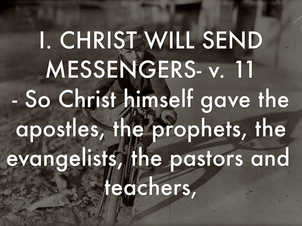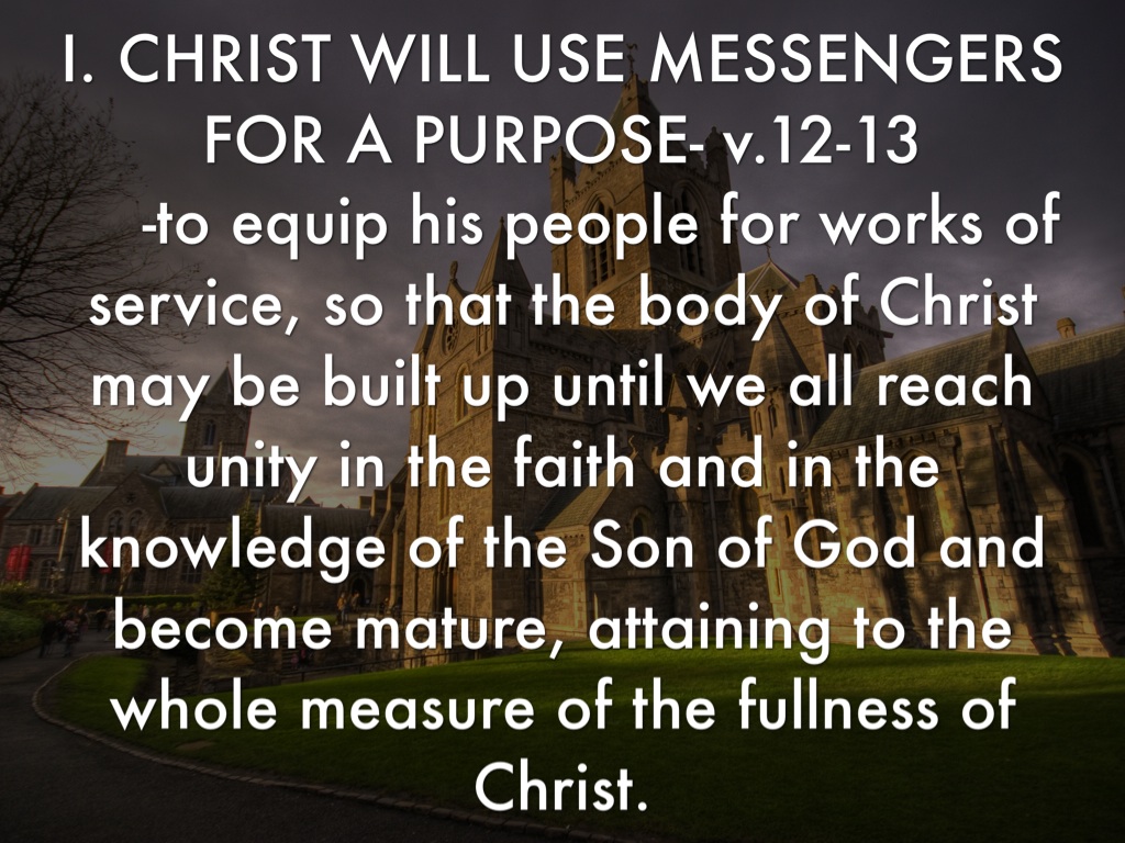 I. CHRIST WILL USE MESSENGERS FOR A PURPOSE- v.12-13 -to equip his people for works of service, so that the body of Christ may be built up until we all reach unity in the faith and in the knowledge of the Son of God and become mature, attaining to the whole measure of the fullness of Christ.