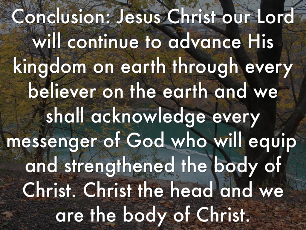 Conclusion: Jesus Christ our Lord will continue to advance His kingdom on earth through every believer on the earth and we shall acknowledge every messenger of God who will equip and strengthened the body of Christ. Christ the head and we are the body of Christ.