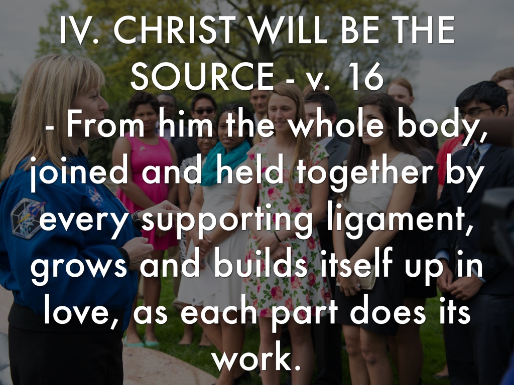 IV. CHRIST WILL BE THE SOURCE - v. 16 - From him the whole body, joined and held together by every supporting ligament, grows and builds itself up in love, as each part does its work.