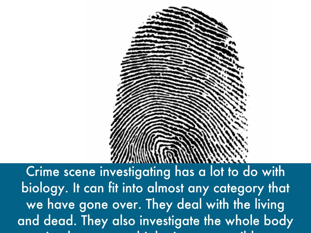 Crime scene investigating has a lot to do with biology. It can fit into almost any category that we have gone over. They deal with the living and dead. They also investigate the whole body in almost every biologic way possible.