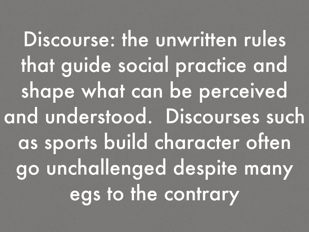 Discourse: the unwritten rules that guide social practice and shape what can be perceived and understood. Discourses such as sports build character often go unchallenged despite many egs to the contrary