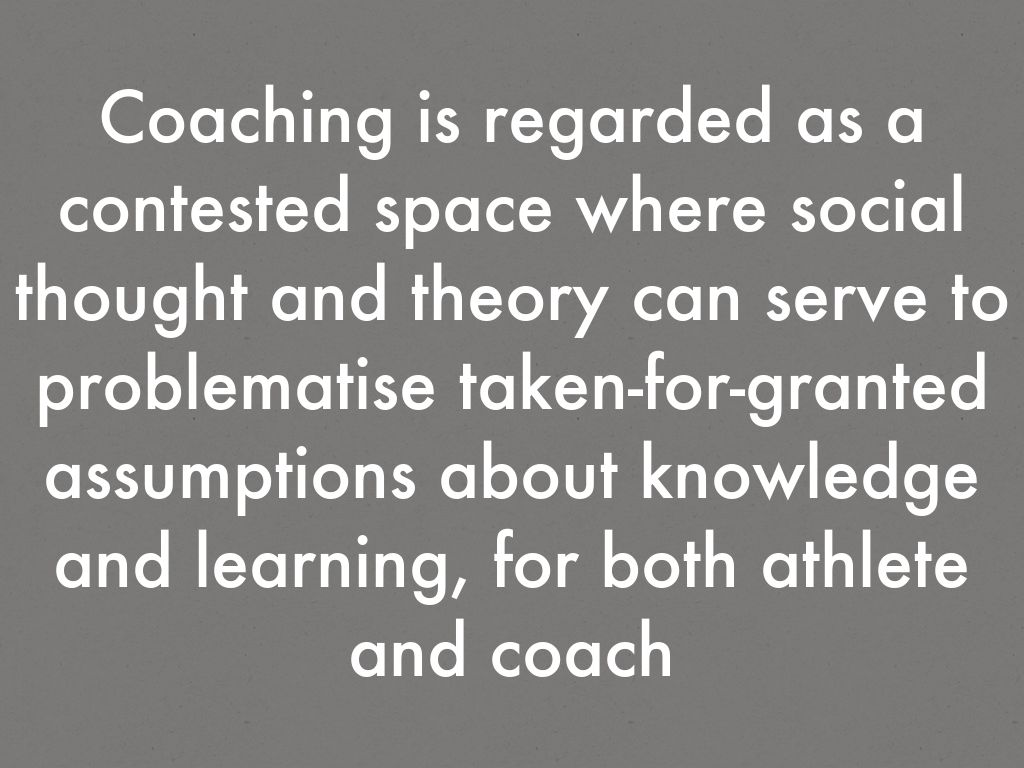 Coaching is regarded as a contested space where social thought and theory can serve to problematise taken-for-granted assumptions about knowledge and learning, for both athlete and coach