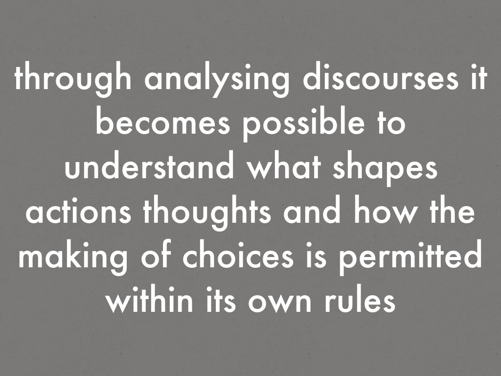 through analysing discourses it becomes possible to understand what shapes actions thoughts and how the making of choices is permitted within its own rules