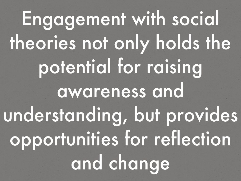 Engagement with social theories not only holds the potential for raising awareness and understanding, but provides opportunities for reflection and change