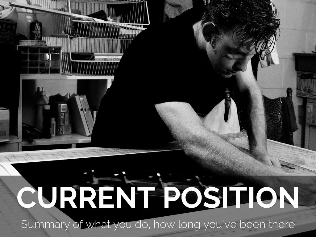 You can change the order of these slides, or add more that follow a similar format, to suit your need or mood, but it might be helpful to showcase your current role, summarizing your primary responsibilities and how long you've been part of the team.
