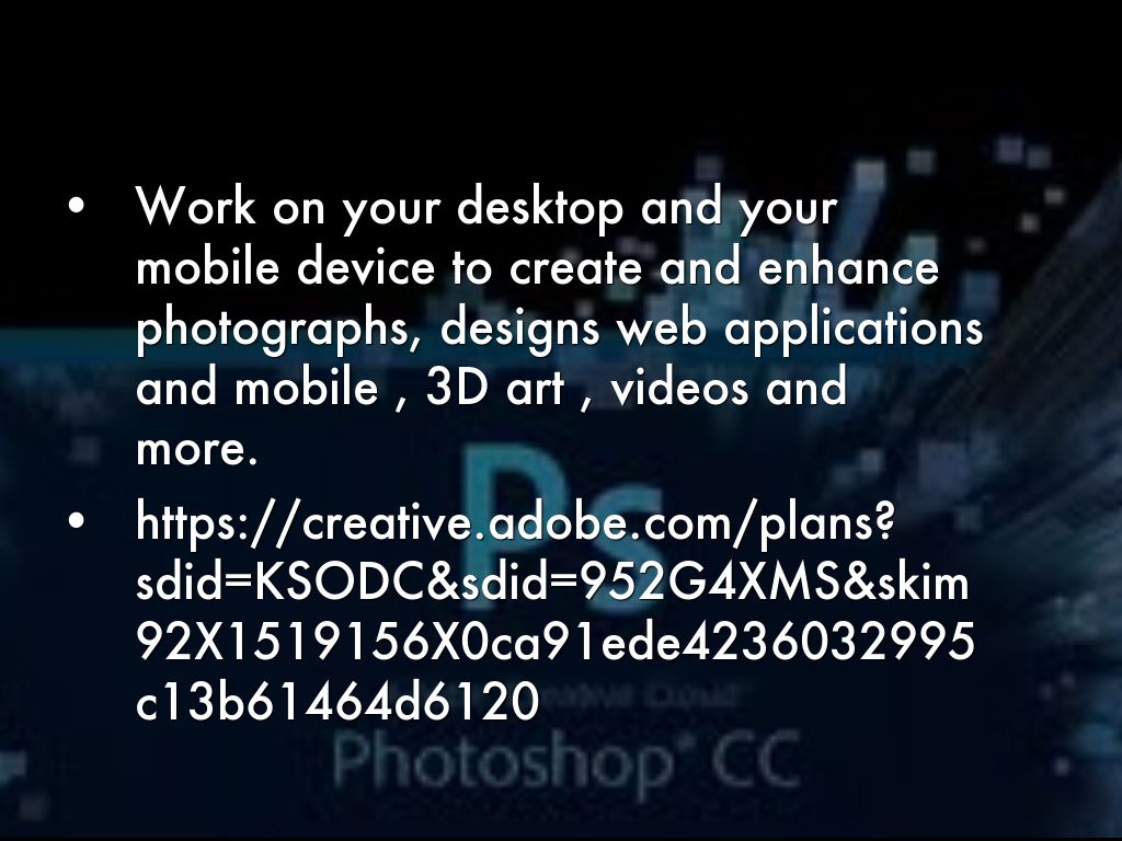 Work on your desktop and your mobile device to create and enhance photographs, designs web applications and mobile , 3D art , videos and more.