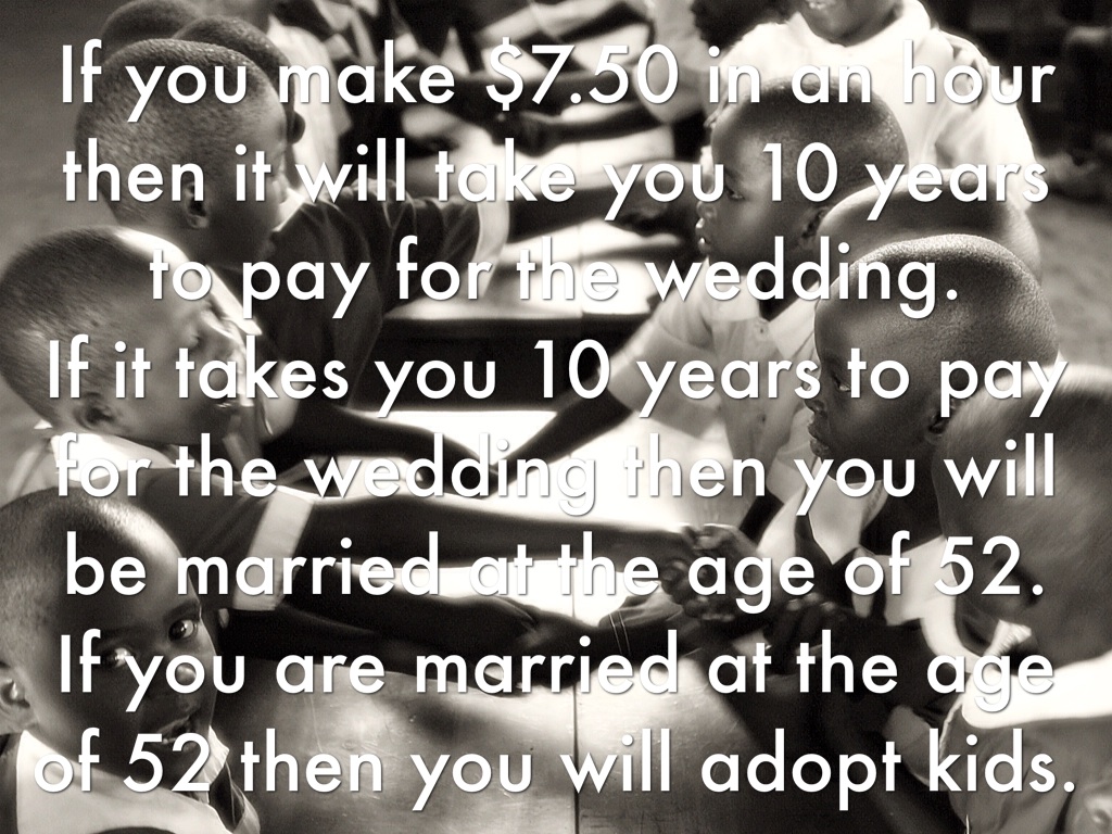 If you make $7.50 in an hour then it will take you 10 years to pay for the wedding. If it takes you 10 years to pay for the wedding then you will be married at the age of 52. If you are married at the age of 52 then you will adopt kids.