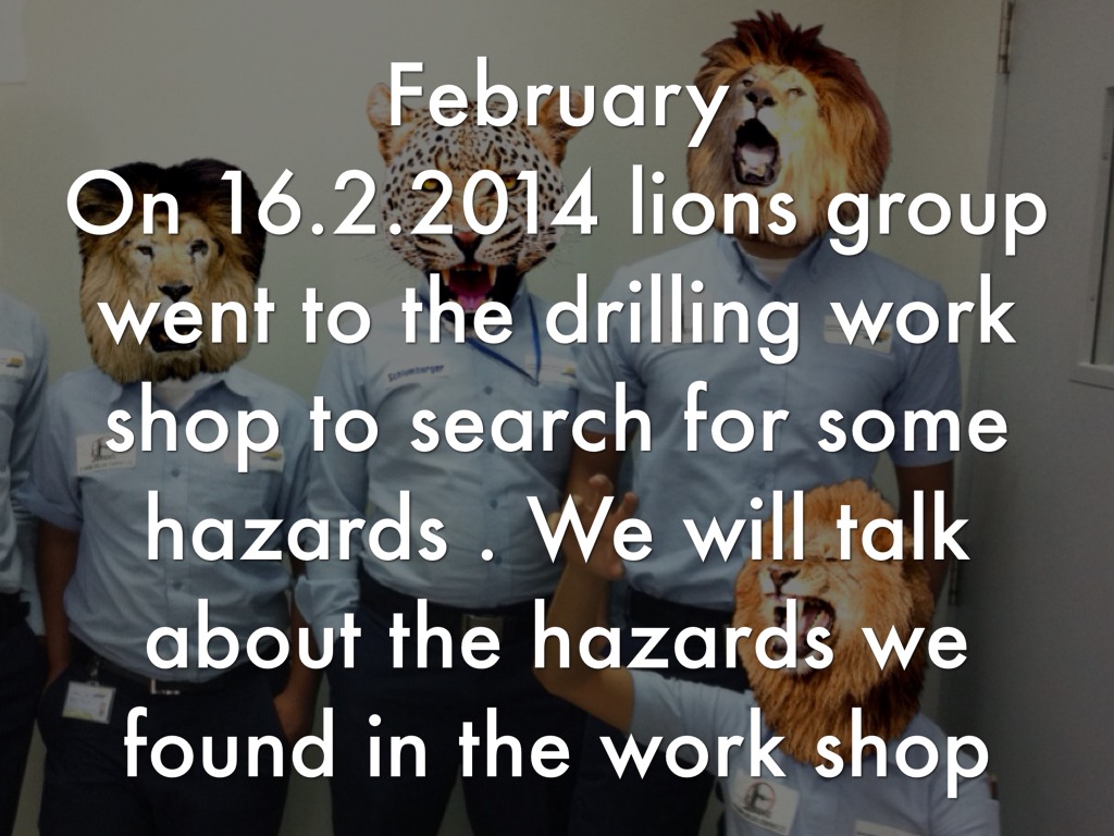 On 16.2.2014 lions group went to the drilling work shop to search for some hazards . We will talk about the hazards we found in the work shop