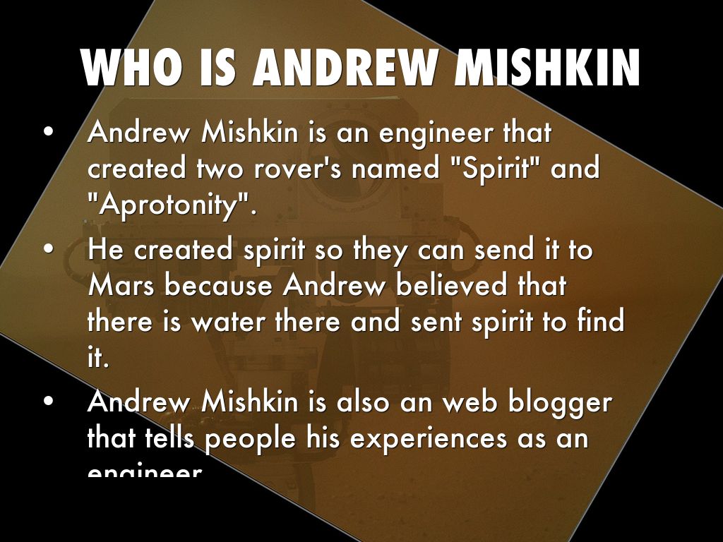Andrew Mishkin is an engineer that created two rover's named "Spirit" and "Aprotonity".