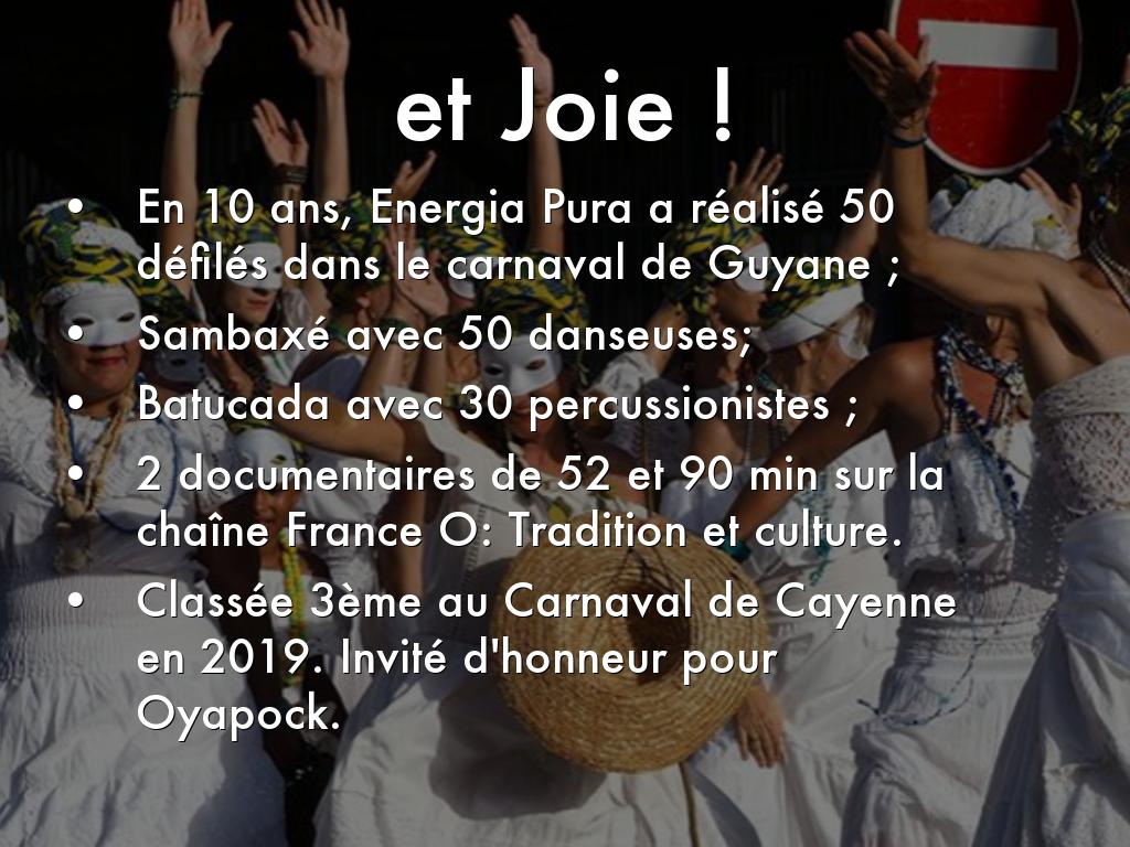 En 10 ans, Energia Pura a réalisé 50 défilés dans le carnaval de Guyane ;