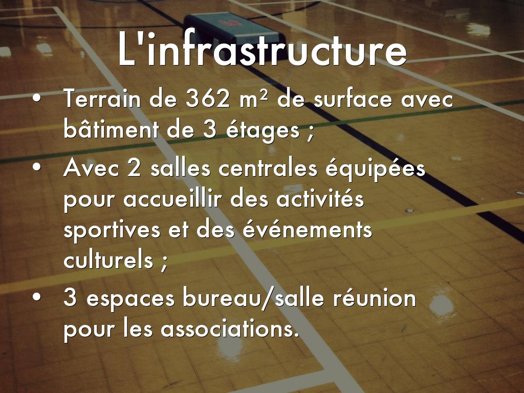 Avec 2 salles centrales équipées pour accueillir des activités sportives et des événements culturels ;