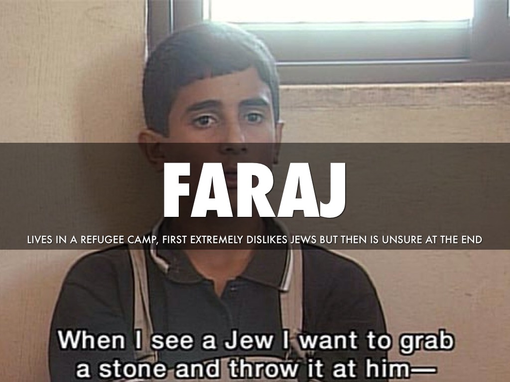 LIVES IN A REFUGEE CAMP, FIRST EXTREMELY DISLIKES JEWS BUT THEN IS UNSURE AT THE END