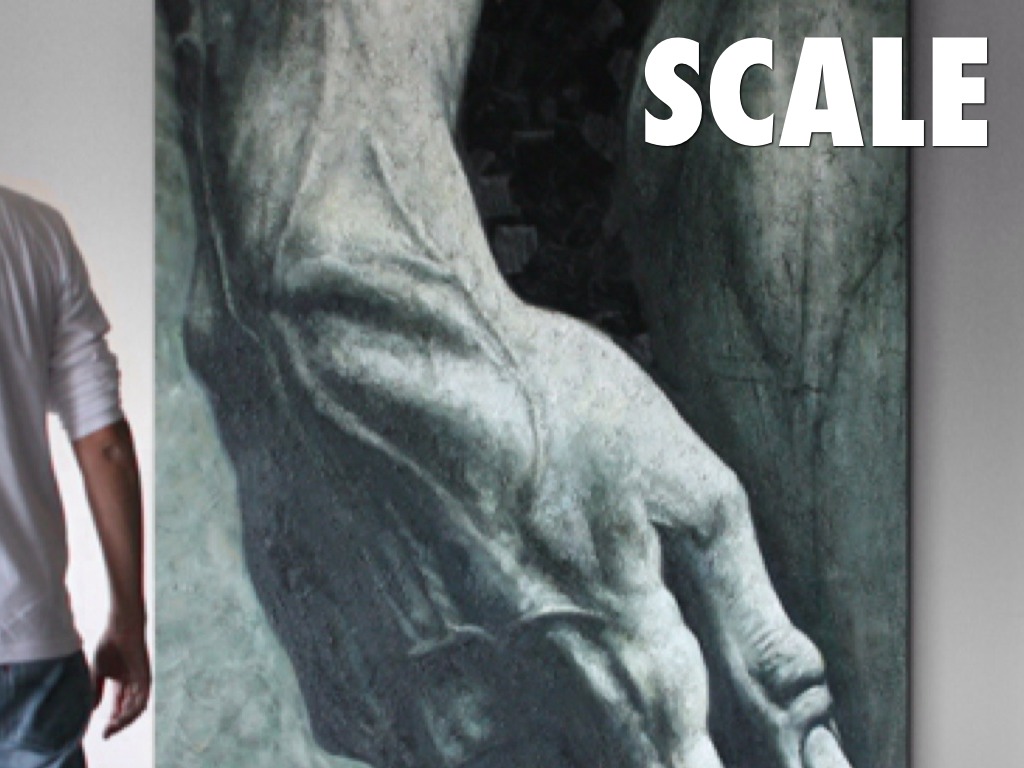 This piece shows scale by having a person stand next to the painting showing how big the piece is to the rest of the world