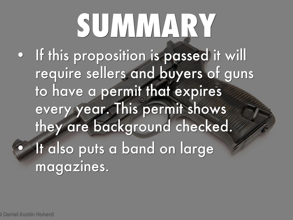 • If this proposition is passed it will require sellers and buyers of guns to have a permit that expires every year. This permit shows they are background checked.