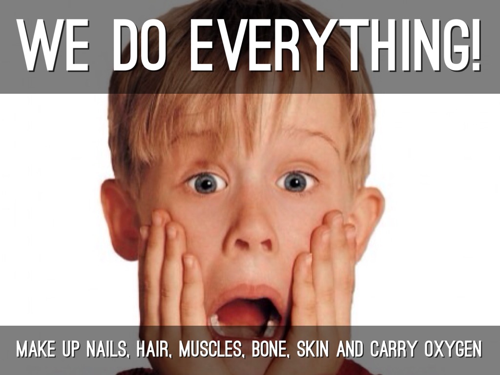 MAKE UP NAILS, HAIR, MUSCLES, BONE, SKIN AND CARRY OXYGEN