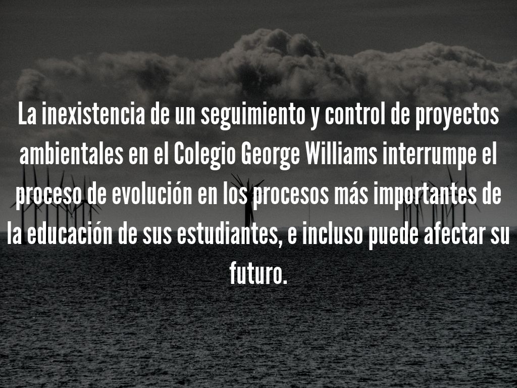 La inexistencia de un seguimiento y control de proyectos ambientales en el Colegio George Williams interrumpe el proceso de evolución en los procesos más importantes de la educación de sus estudiantes, e incluso puede afectar su futuro.