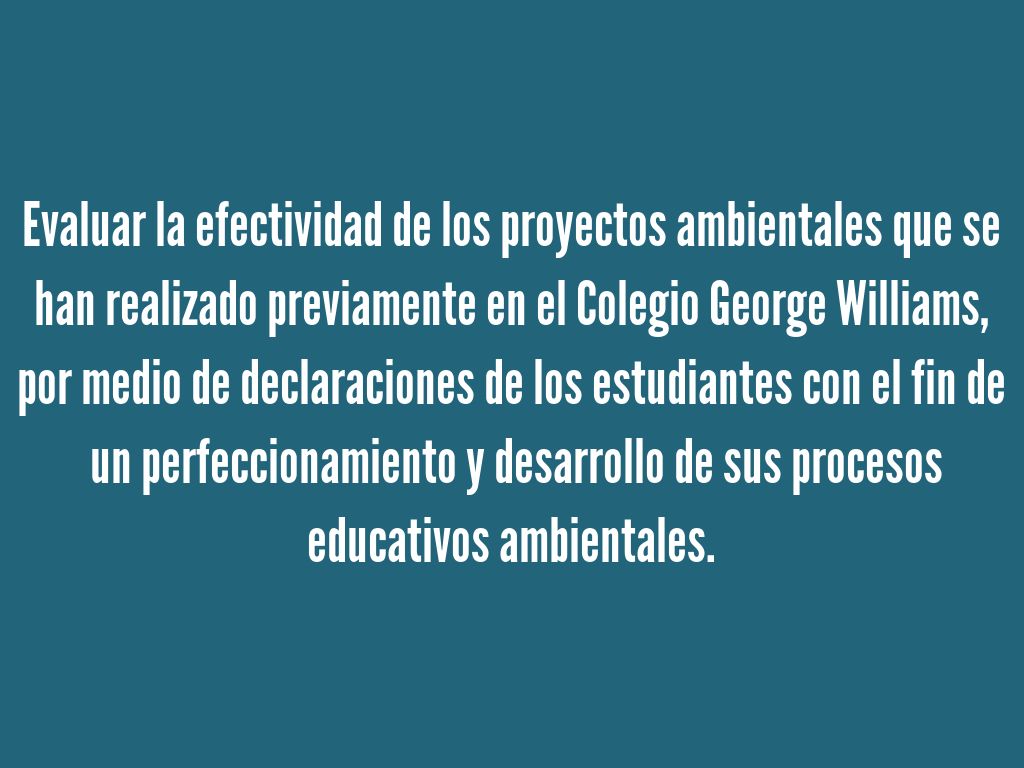 Evaluar la efectividad de los proyectos ambientales que se han realizado previamente en el Colegio George Williams, por medio de declaraciones de los estudiantes con el fin de un perfeccionamiento y desarrollo de sus procesos educativos ambientales.
