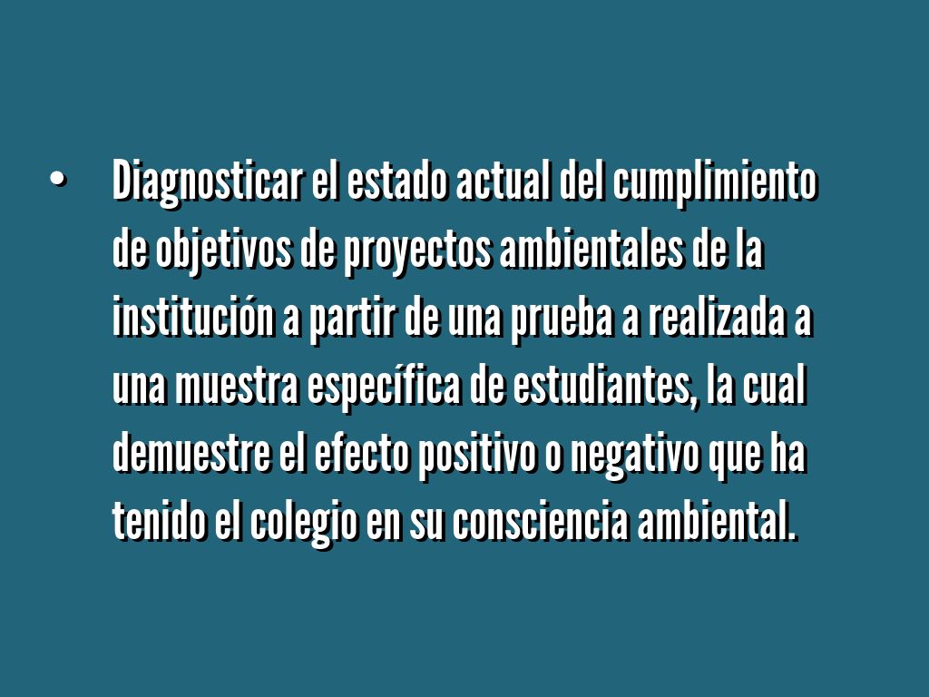 Diagnosticar el estado actual del cumplimiento de objetivos de proyectos ambientales de la institución a partir de una prueba a realizada a una muestra específica de estudiantes, la cual demuestre el efecto positivo o negativo que ha tenido el colegio en su consciencia ambiental.