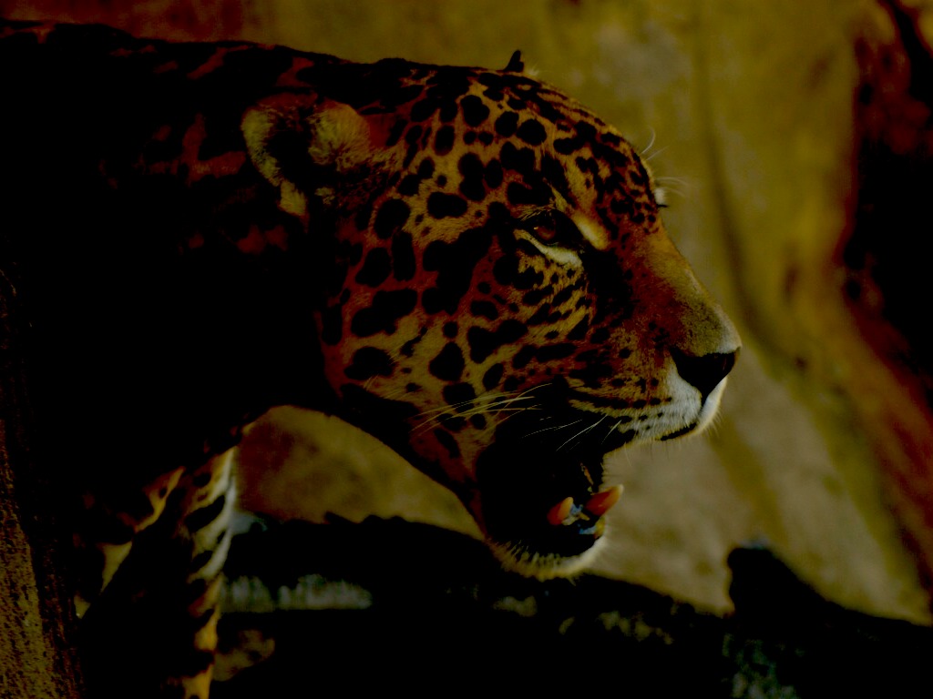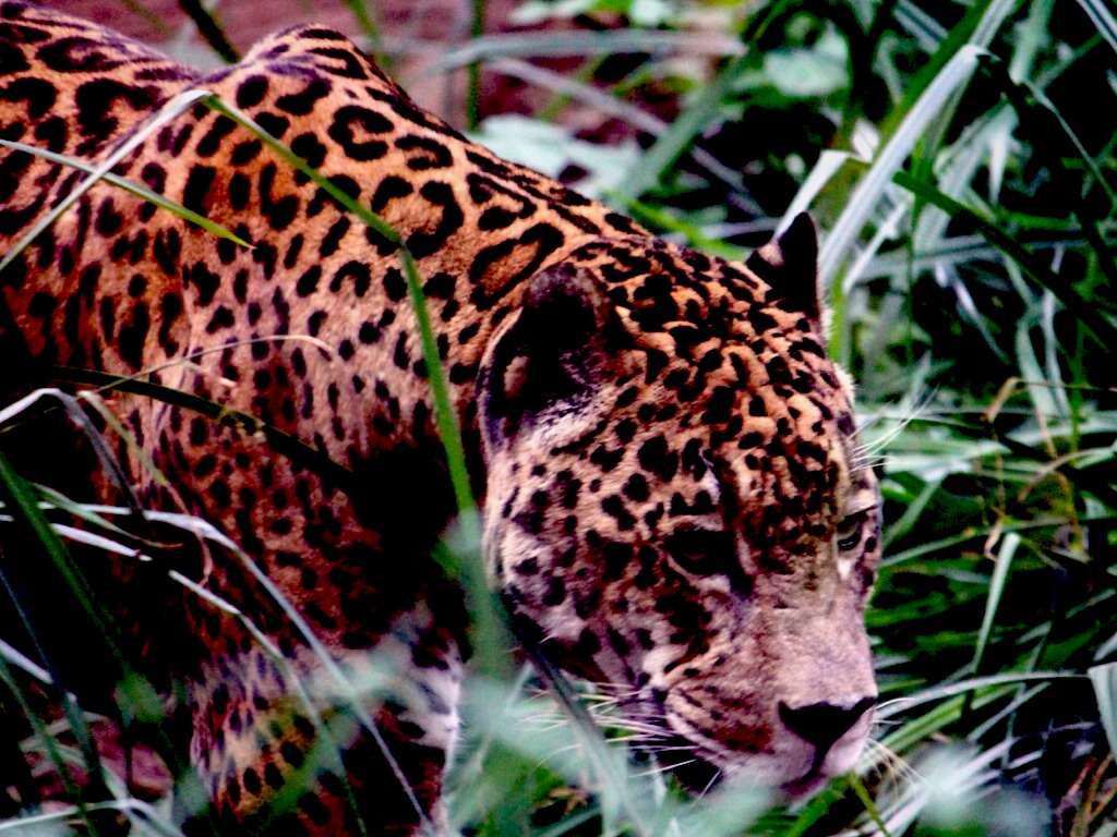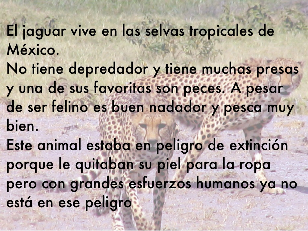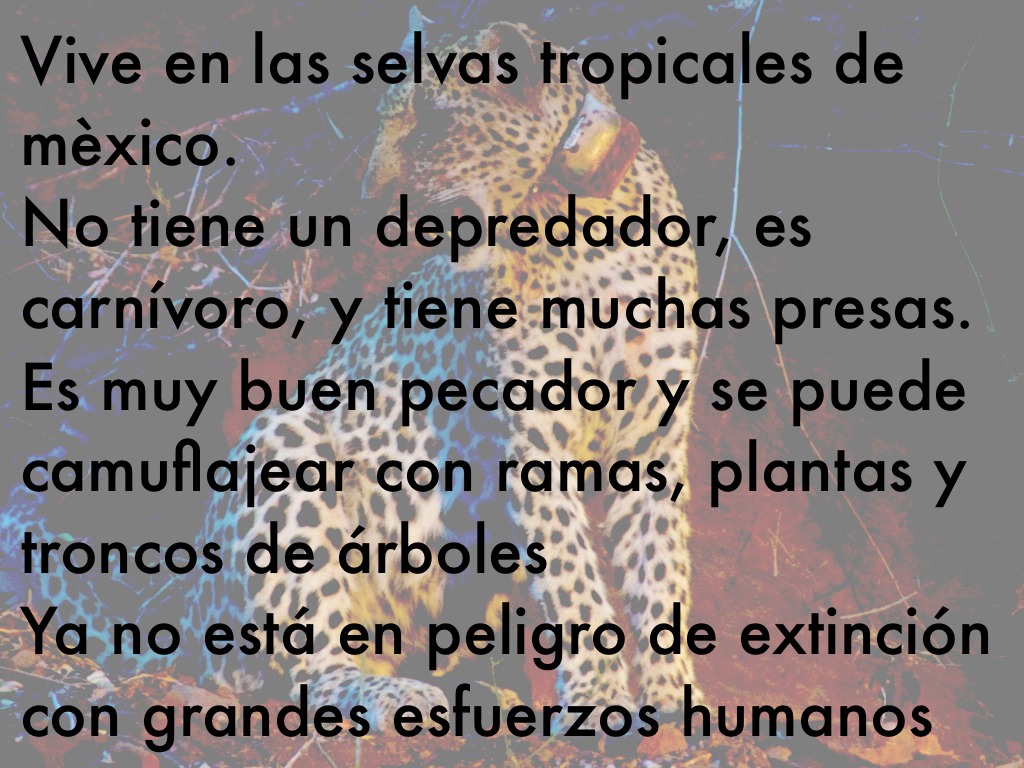 El jaguar vive en las selvas tropicales de México. No tiene depredador y tiene muchas presas y una de sus favoritas son peces. A pesar de ser felino es buen nadador y pesca muy bien. Este animal estaba en peligro de extinción porque le quitaban su piel para la ropa pero con grandes esfuerzos humanos ya no está en ese peligro
