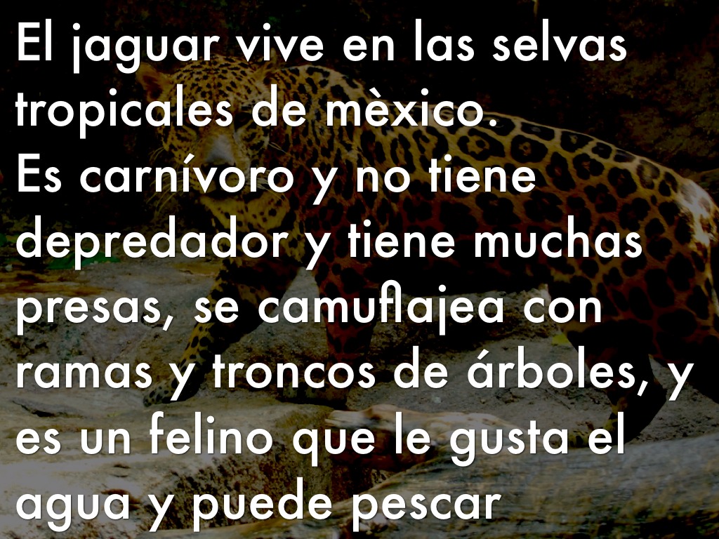 El jaguar vive en las selvas tropicales de mèxico. Es carnívoro y no tiene depredador y tiene muchas presas, se camuflajea con ramas y troncos de árboles, y es un felino que le gusta el agua y puede pescar
