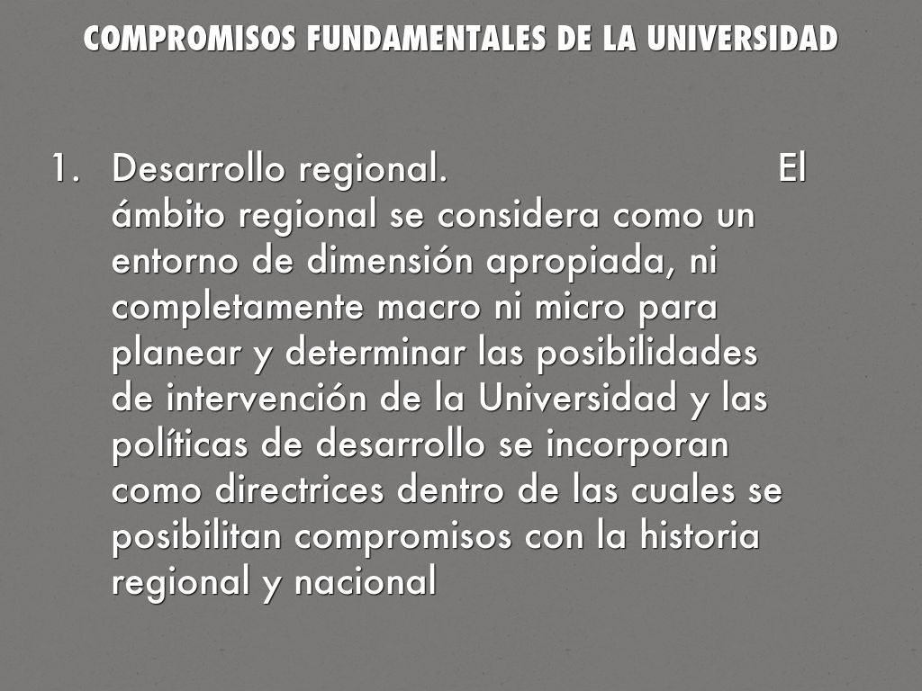 • Desarrollo regional. El ámbito regional se considera como un entorno de dimensión apropiada, ni completamente macro ni micro para planear y determinar las posibilidades de intervención de la Universidad y las políticas de desarrollo se incorporan como directrices dentro de las cuales se posibilitan compromisos con la historia regional y nacional