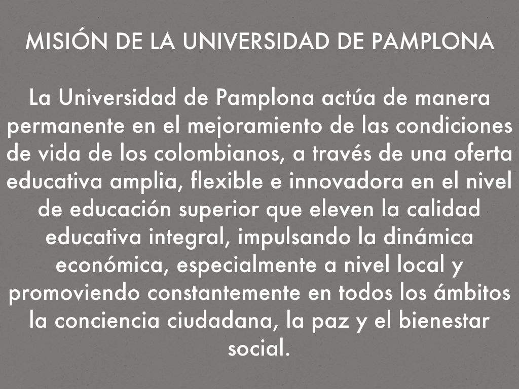 La Universidad de Pamplona actúa de manera permanente en el mejoramiento de las condiciones de vida de los colombianos, a través de una oferta educativa amplia, flexible e innovadora en el nivel de educación superior que eleven la calidad educativa integral, impulsando la dinámica económica, especialmente a nivel local y promoviendo constantemente en todos los ámbitos la conciencia ciudadana, la paz y el bienestar social.