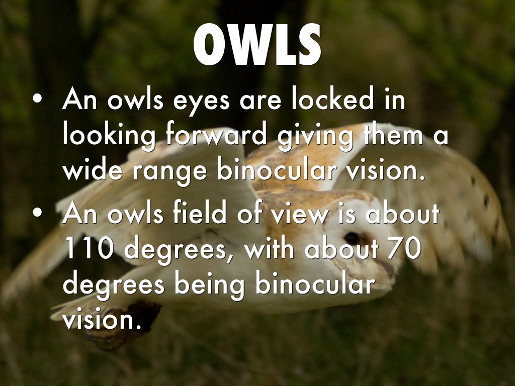 An owls eyes are locked in looking forward giving them a wide range binocular vision.