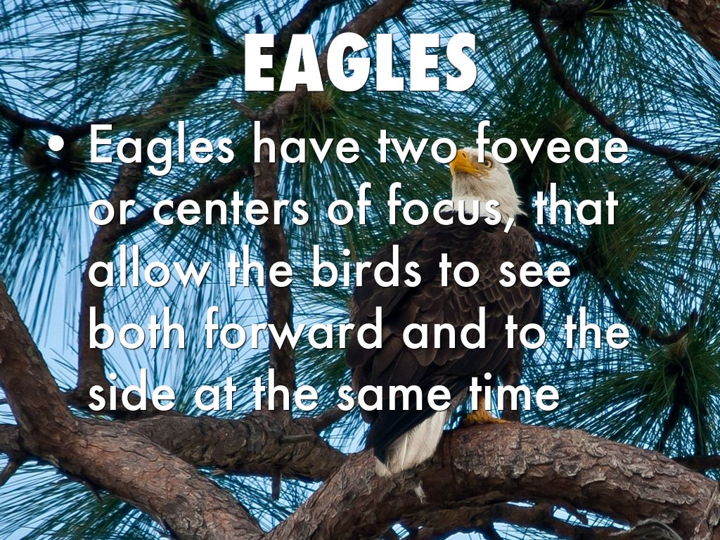 Eagles have two foveae or centers of focus, that allow the birds to see both forward and to the side at the same time