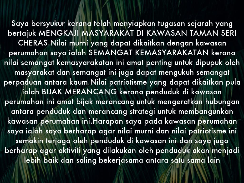 Saya bersyukur kerana telah menyiapkan tugasan sejarah yang bertajuk MENGKAJI MASYARAKAT DI KAWASAN TAMAN SERI CHERAS.Nilai murni yang dapat dikaitkan dengan kawasan perumahan saya ialah SEMANGAT KEMASYARAKATAN kerana nilai semangat kemasyarakatan ini amat penting untuk dipupuk oleh masyarakat dan semangat ini juga dapat mengukuh semangat perpaduan antara kaum.Nilai patriotisme yang dapat dikaitkan pula ialah BIJAK MERANCANG kerana penduduk di kawasan perumahan ini amat bijak merancang untuk mengeratkan hubungan antara penduduk dan merancang strategi untuk membangunkan kawasan perumahan ini.Harapan saya pada kawasan perumahan saya ialah saya berharap agar nilai murni dan nilai patriotisme ini semakin terjaga oleh penduduk di kawasan ini dan saya juga berharap agar aktiviti yang dilakukan oleh penduduk akan menjadi lebih baik dan saling bekerjasama antara satu sama lain.