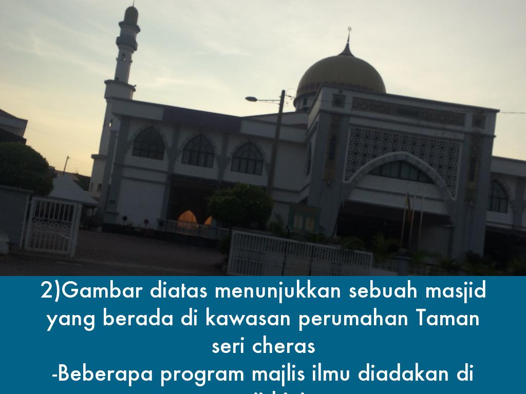 2)Gambar diatas menunjukkan sebuah masjid yang berada di kawasan perumahan Taman seri cheras -Beberapa program majlis ilmu diadakan di masjid ini. -Cth:ceramah,majlis pertunangan,perkahwinan dan hafazan.