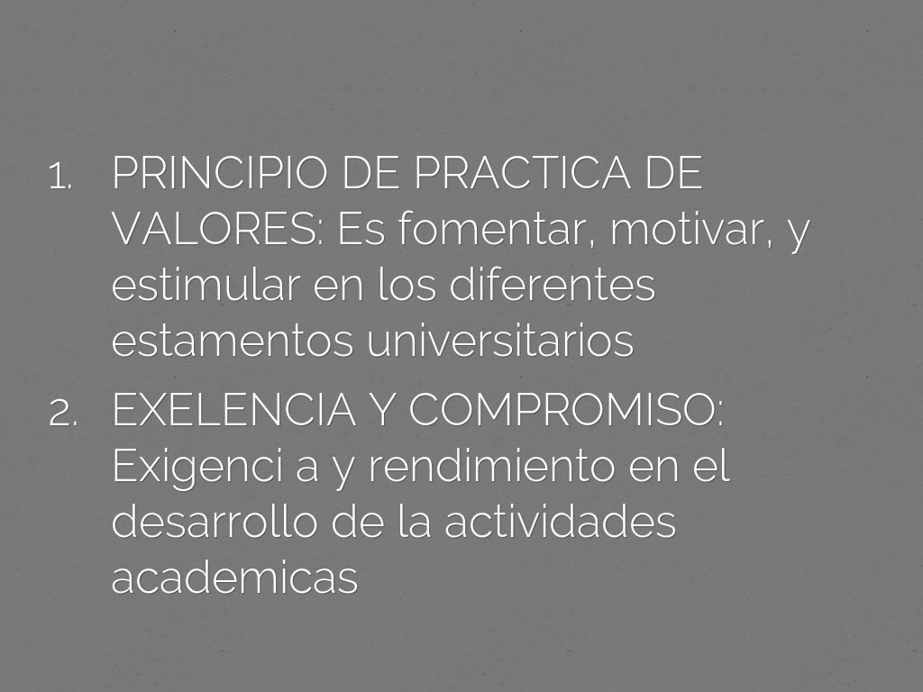 PRINCIPIO DE PRACTICA DE VALORES: Es fomentar, motivar, y estimular en los diferentes estamentos universitarios.