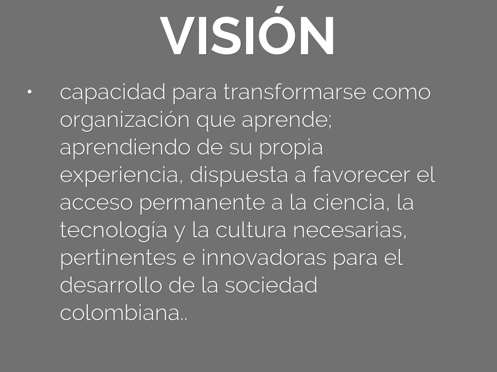 capacidad para transformarse como organización que aprende; aprendiendo de su propia experiencia, dispuesta a favorecer el acceso permanente a la ciencia, la tecnología y la cultura necesarias, pertinentes e innovadoras para el desarrollo de la sociedad colombiana..