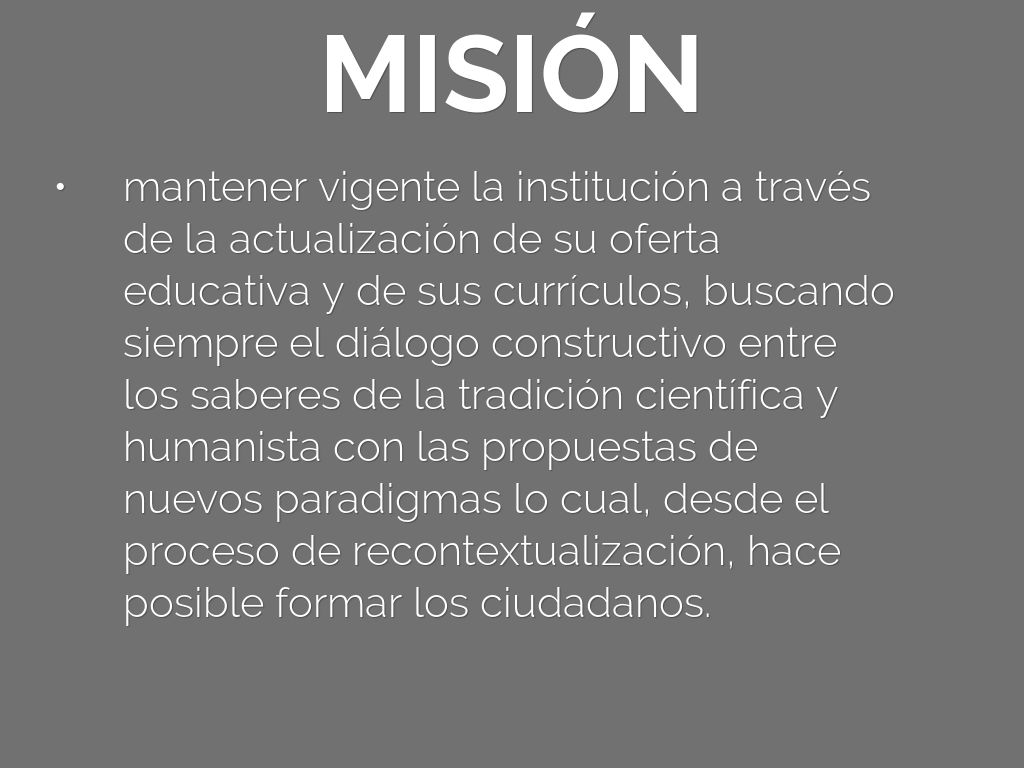 mantener vigente la institución a través de la actualización de su oferta educativa y de sus currículos, buscando siempre el diálogo constructivo entre los saberes de la tradición científica y humanista con las propuestas de nuevos paradigmas lo cual, desde el proceso de recontextualización, hace posible formar los ciudadanos.