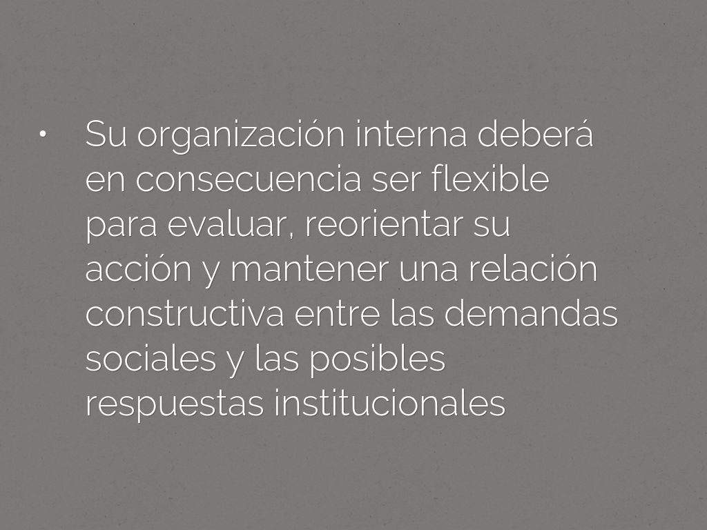 Su organización interna deberá en consecuencia ser flexible para evaluar, reorientar su acción y mantener una relación constructiva entre las demandas sociales y las posibles respuestas institucionales