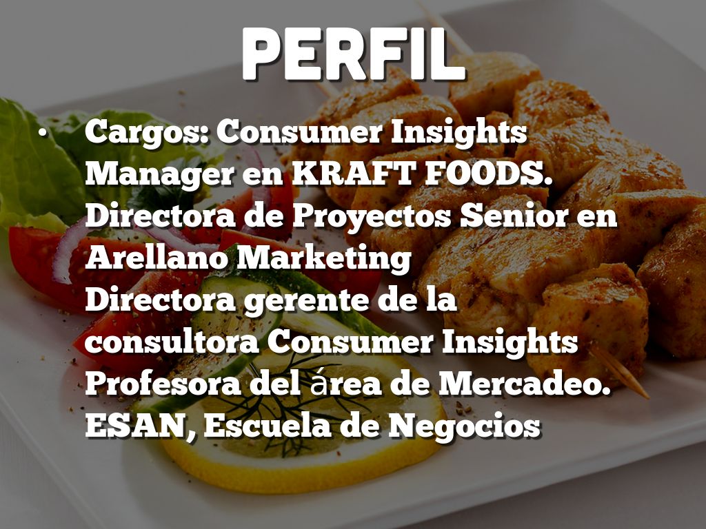 Cargos: Consumer Insights Manager en KRAFT FOODS. Directora de Proyectos Senior en Arellano Marketing Directora gerente de la consultora Consumer Insights Profesora del área de Mercadeo. ESAN, Escuela de Negocios