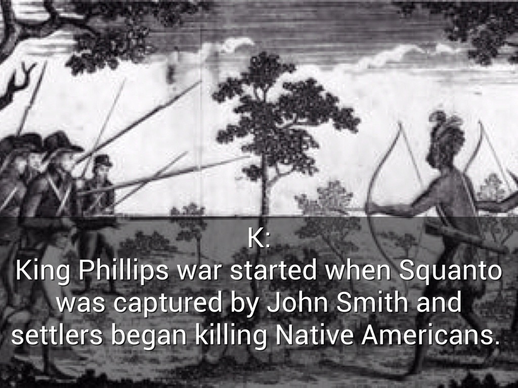 King Phillips war started when Squanto was captured by John Smith and settlers began killing Native Americans.