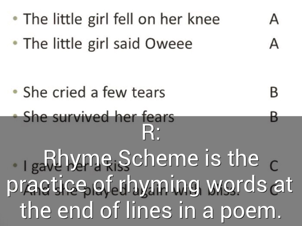 Rhyme Scheme is the practice of rhyming words at the end of lines in a poem.