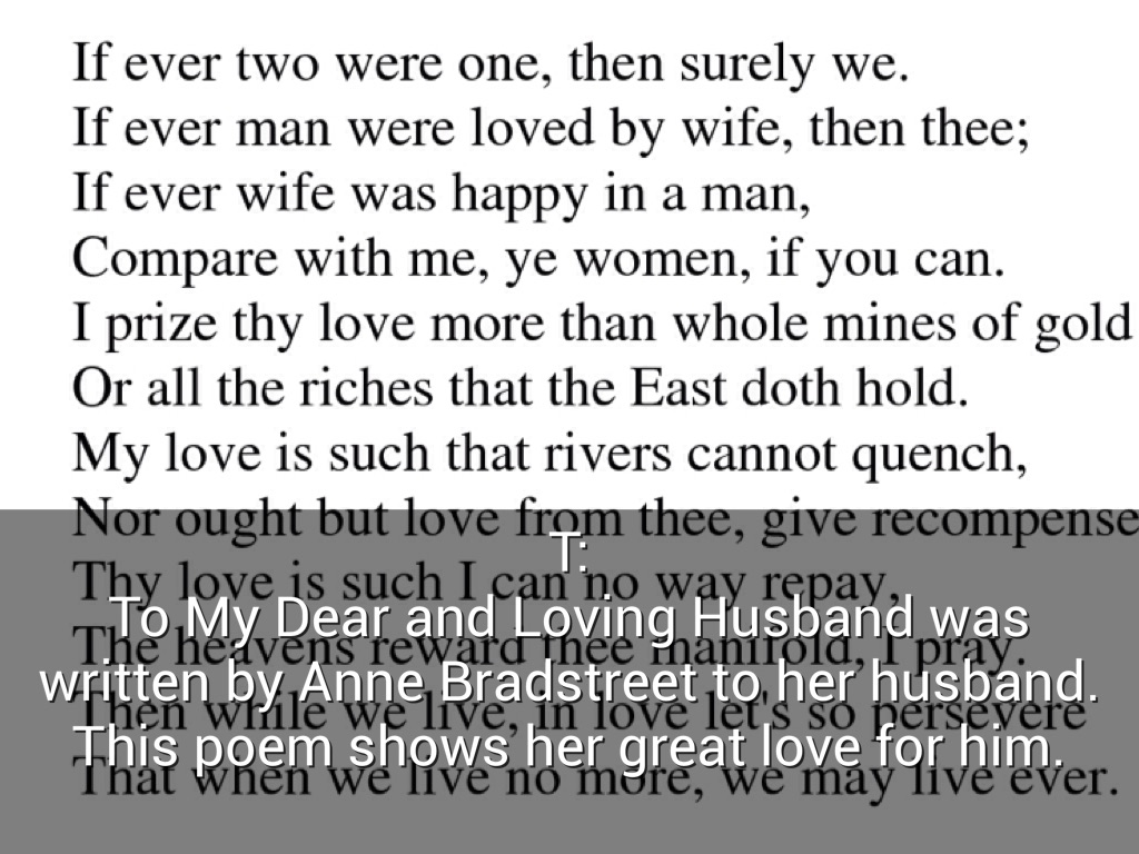 To My Dear and Loving Husband was written by Anne Bradstreet to her husband. This poem shows her great love for him.