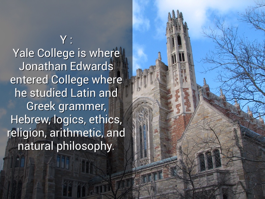 Yale College is where Jonathan Edwards entered College where he studied Latin and Greek grammer, Hebrew, logics, ethics, religion, arithmetic, and natural philosophy.