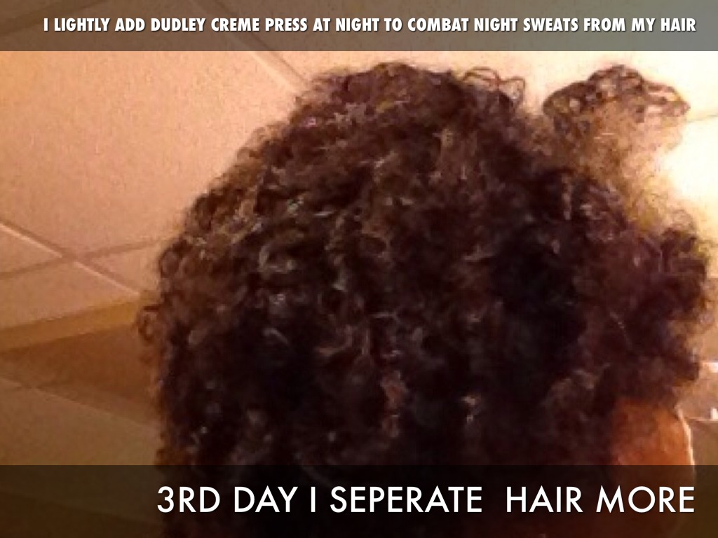 I LIGHTLY ADD DUDLEY CREME PRESS AT NIGHT TO COMBAT NIGHT SWEATS FROM MY HAIR