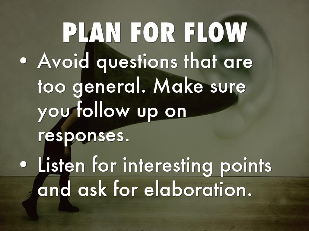 • Avoid questions that are too general. Make sure you follow up on responses.
