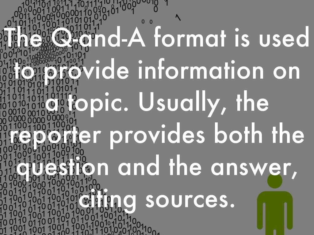 The Q-and-A format is used to provide information on a topic. Usually, the reporter provides both the question and the answer, citing sources.