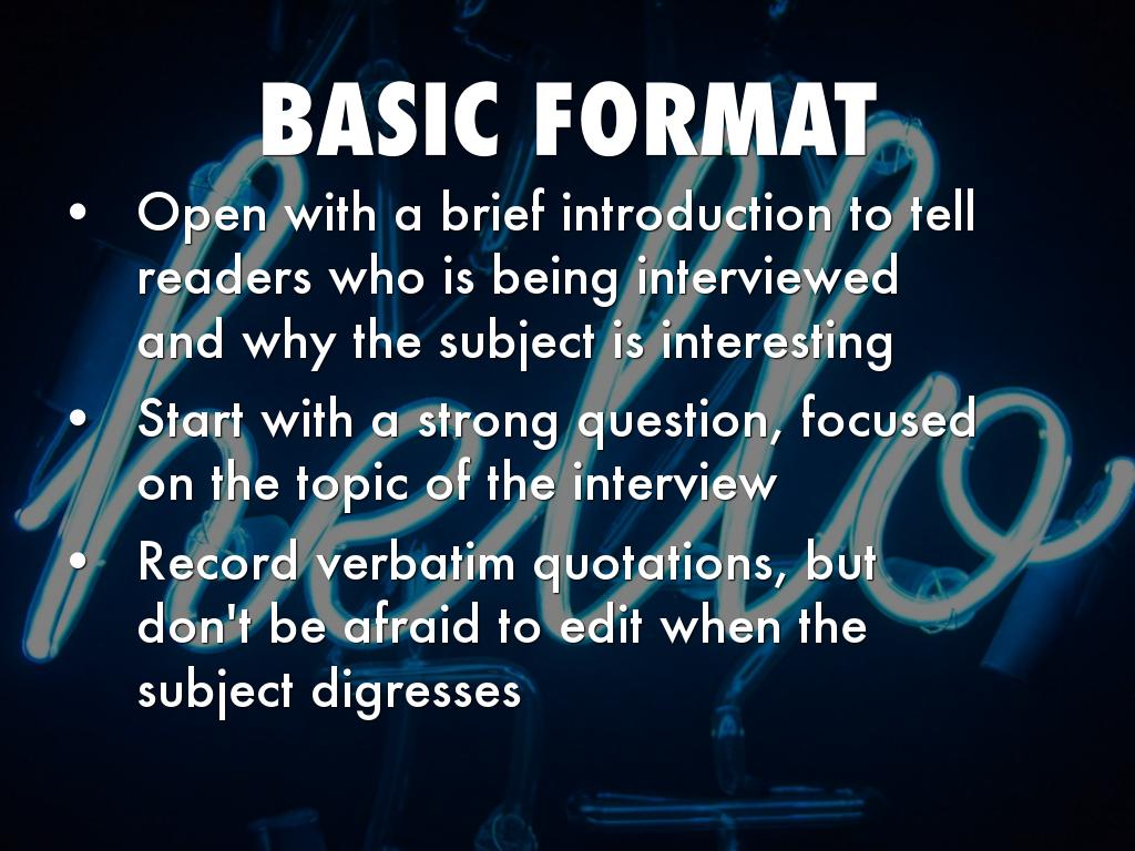 • Open with a brief introduction to tell readers who is being interviewed and why the subject is interesting
