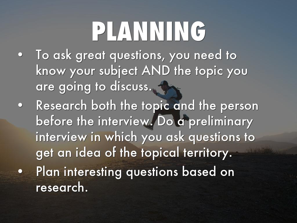 • Research both the topic and the person before the interview. Do a preliminary interview in which you ask questions to get an idea of the topical territory.
