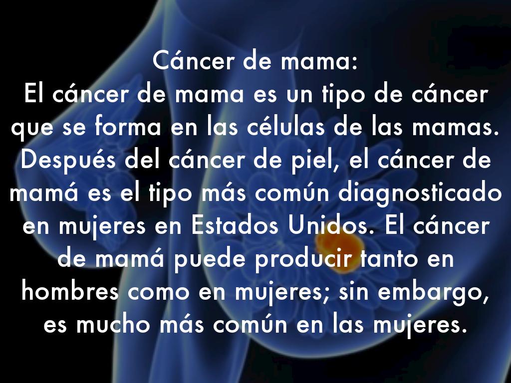 Después del cáncer de piel, el cáncer de mamá es el tipo más común diagnosticado en mujeres en Estados Unidos. El cáncer de mamá puede producir tanto en hombres como en mujeres; sin embargo, es mucho más común en las mujeres.