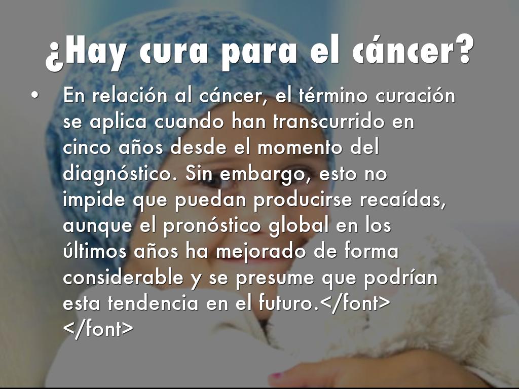 - En relación al cáncer, el término curación se aplica cuando han transcurrido en cinco años desde el momento del diagnóstico. Sin embargo, esto no impide que puedan producirse recaídas, aunque el pronóstico global en los últimos años ha mejorado de forma considerable y se presume que podrían esta tendencia en el futuro.
