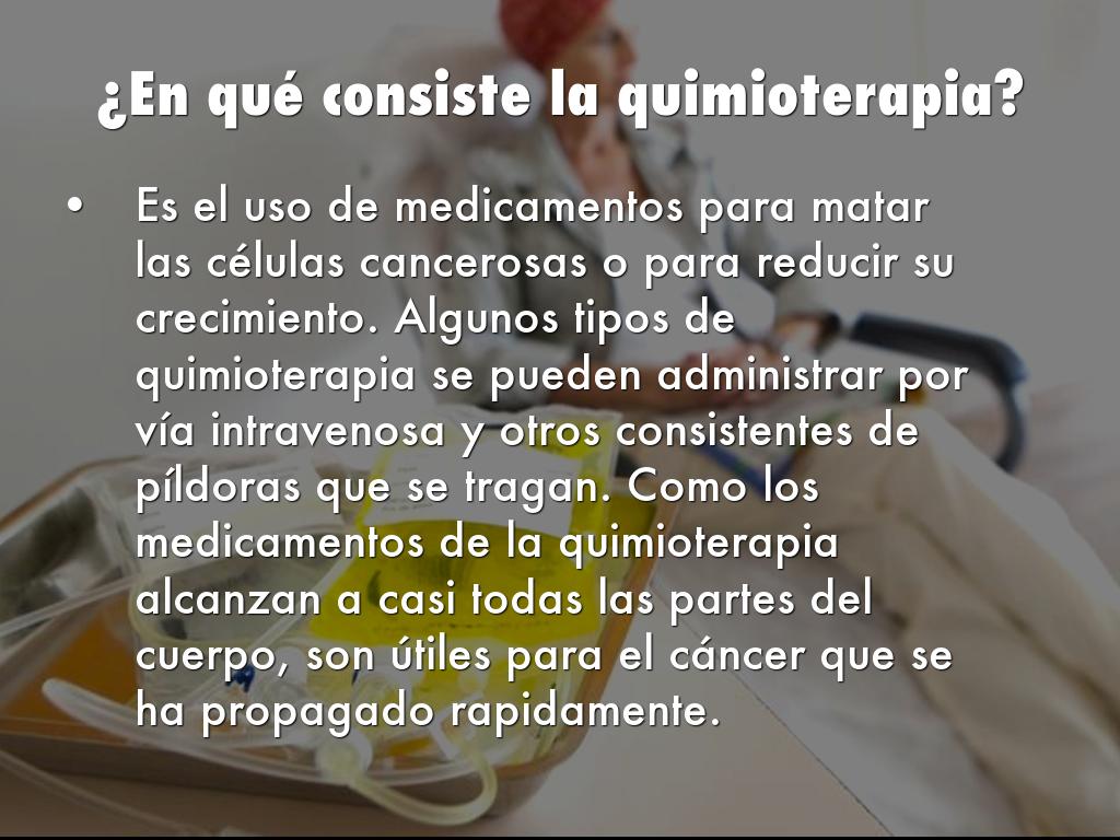 - Es el uso de medicamentos para matar las células cancerosas o para reducir su crecimiento. Algunos tipos de quimioterapia se pueden administrar por vía intravenosa y otros consistentes de píldoras que se tragan. Como los medicamentos de la quimioterapia alcanzan a casi todas las partes del cuerpo, son útiles para el cáncer que se ha propagado rapidamente.