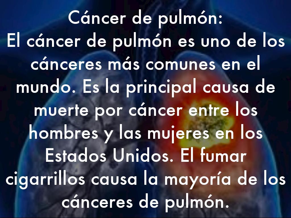 El cáncer de pulmón es uno de los cánceres más comunes en el mundo. Es la principal causa de muerte por cáncer entre los hombres y las mujeres en los Estados Unidos. El fumar cigarrillos causa la mayoría de los cánceres de pulmón.