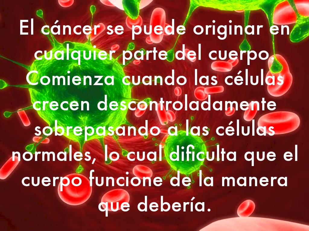 El cáncer se puede originar en cualquier parte del cuerpo. Comienza cuando las células crecen descontroladamente sobrepasando a las células normales, lo cual dificulta que el cuerpo funcione de la manera que debería.