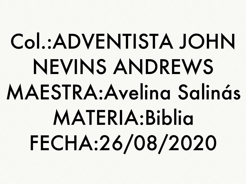 Col.:ADVENTISTA JOHN NEVINS ANDREWS MAESTRA:Avelina Salinás MATERIA:Biblia FECHA:26/08/2020